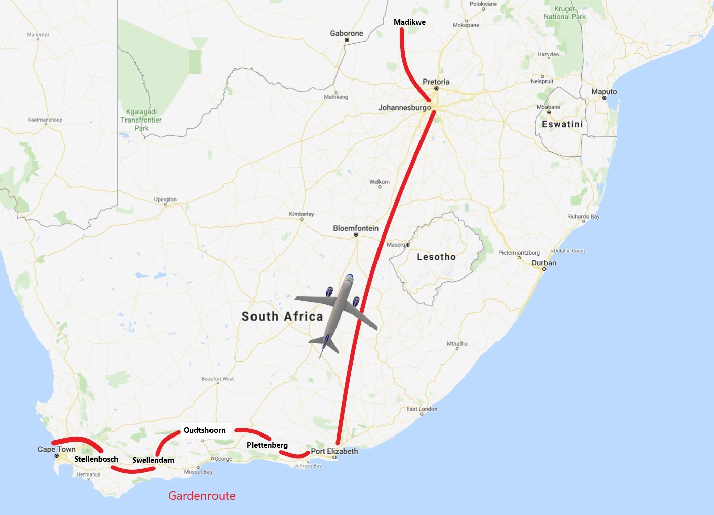 Die Reise startete in Kapstadt und verlief über Stellenbosch und die Gardenroute bis Port Elizabeth zum Addo Elephant Park. Von dort flogen wir nach Johannesburg, um dann ein paar Tage im Madikwe Game Reserve zu verbringen.